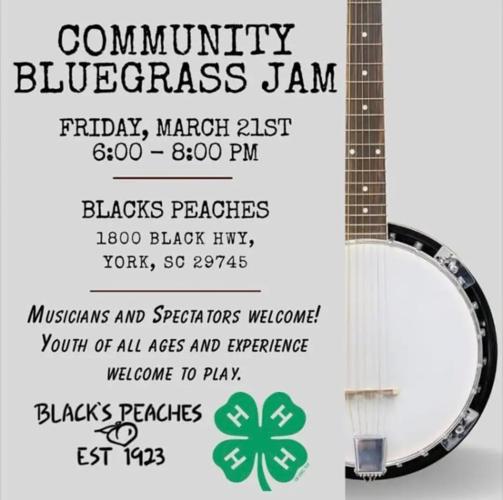 Black’s Peaches in York will host York County 4-H’s first Community Bluegrass Jam of the season on Friday, March 21 from 6-8 pm.